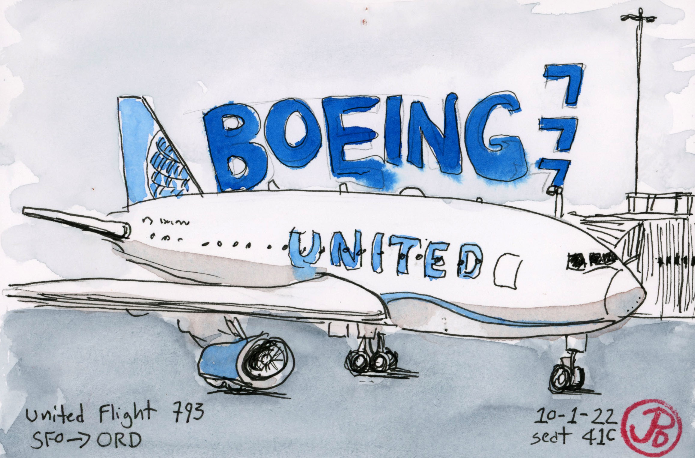 On my recent trip to the Windy City, I sketched the airplane that would be taking me there. In this case it was United Airlines largest plane in their fleet: the Boeing 777-222A. This plane has a capacity of 28 first class passengers and 336 economy. It’s cruising speed is 639 mph and we made the journey from SFO to ORD in about three and half hours.