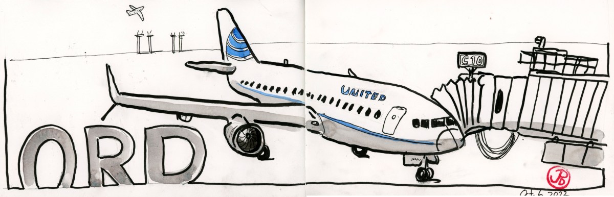 As I was sketching the tails of a line of United planes, an arriving flight pulled in front of my subjects. Good thing I had inked most of my sketch. Planes do move after all. Just not the ways a sketcher may want them to.