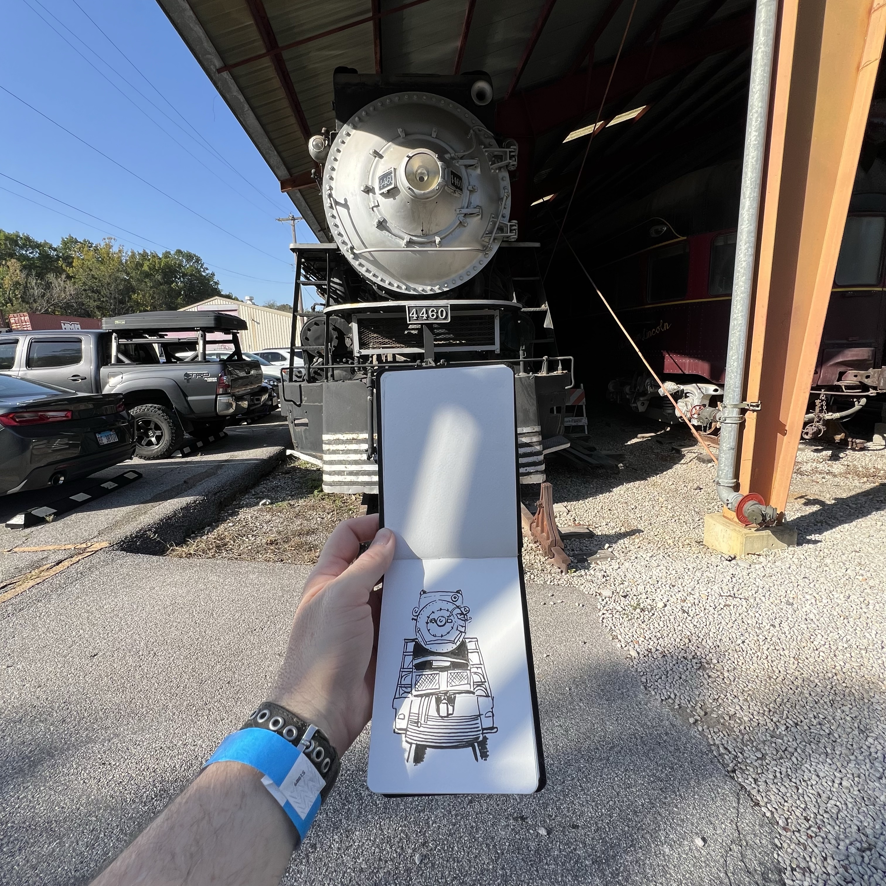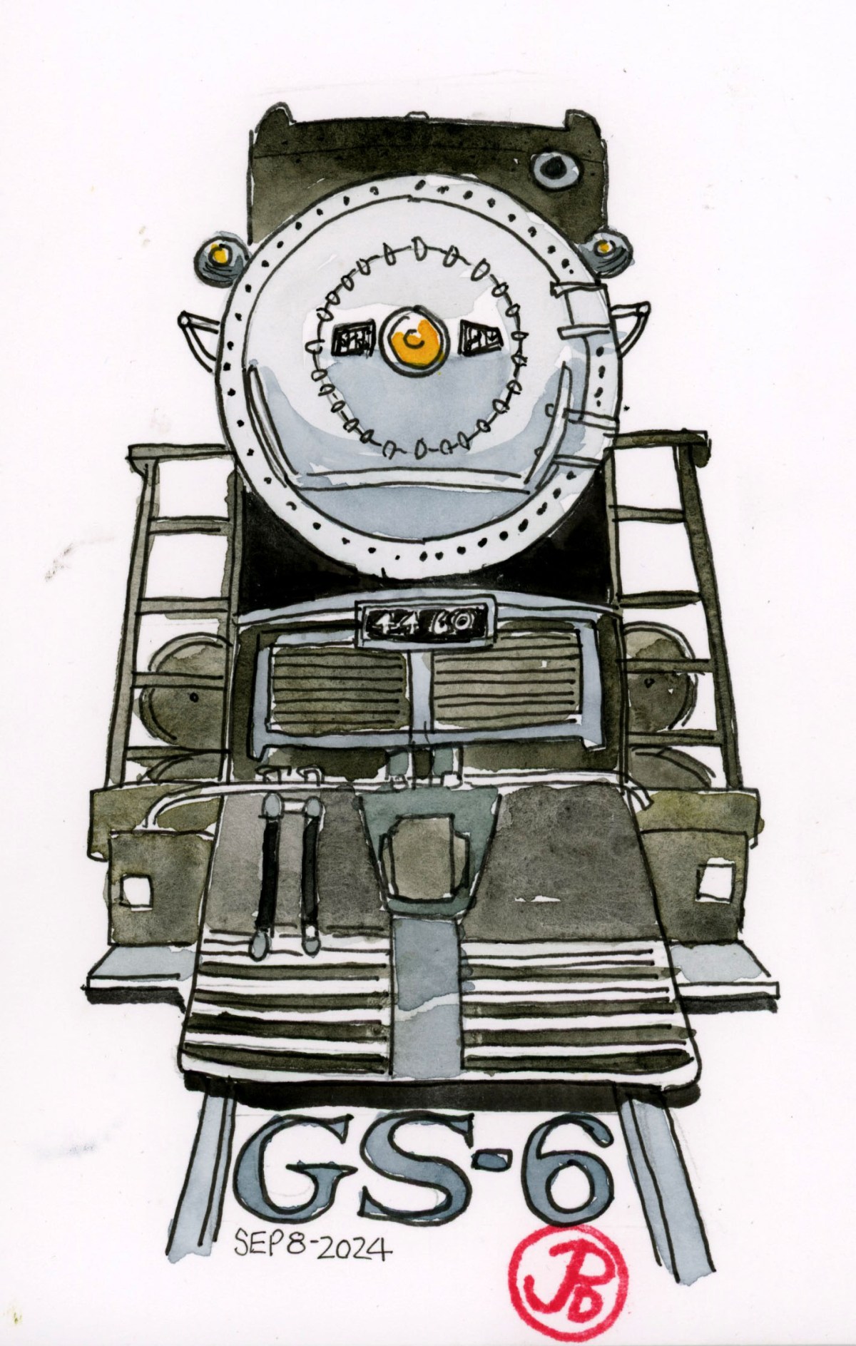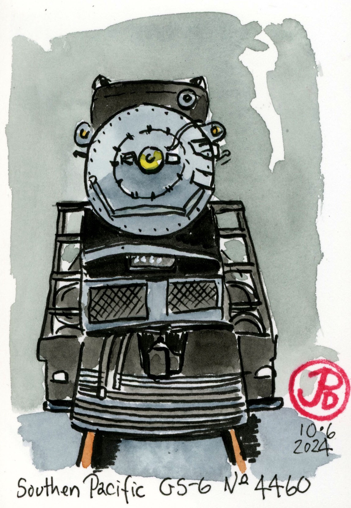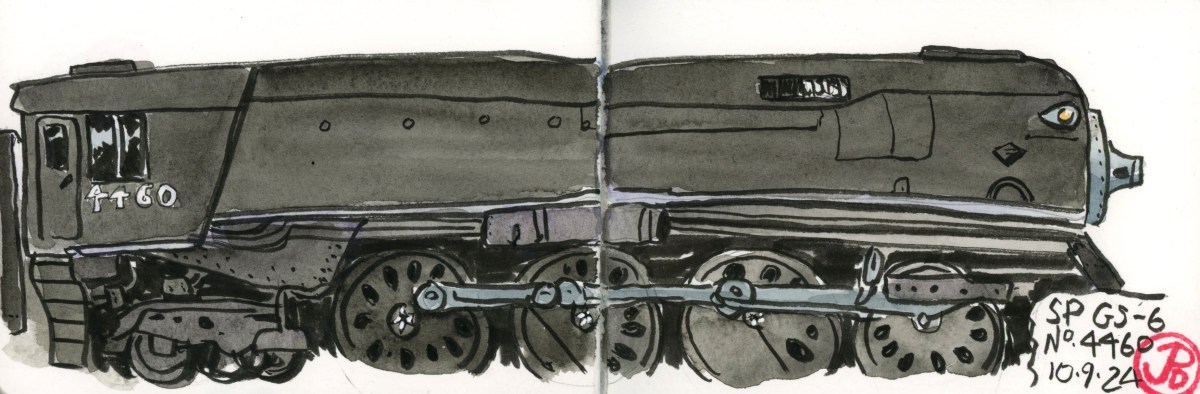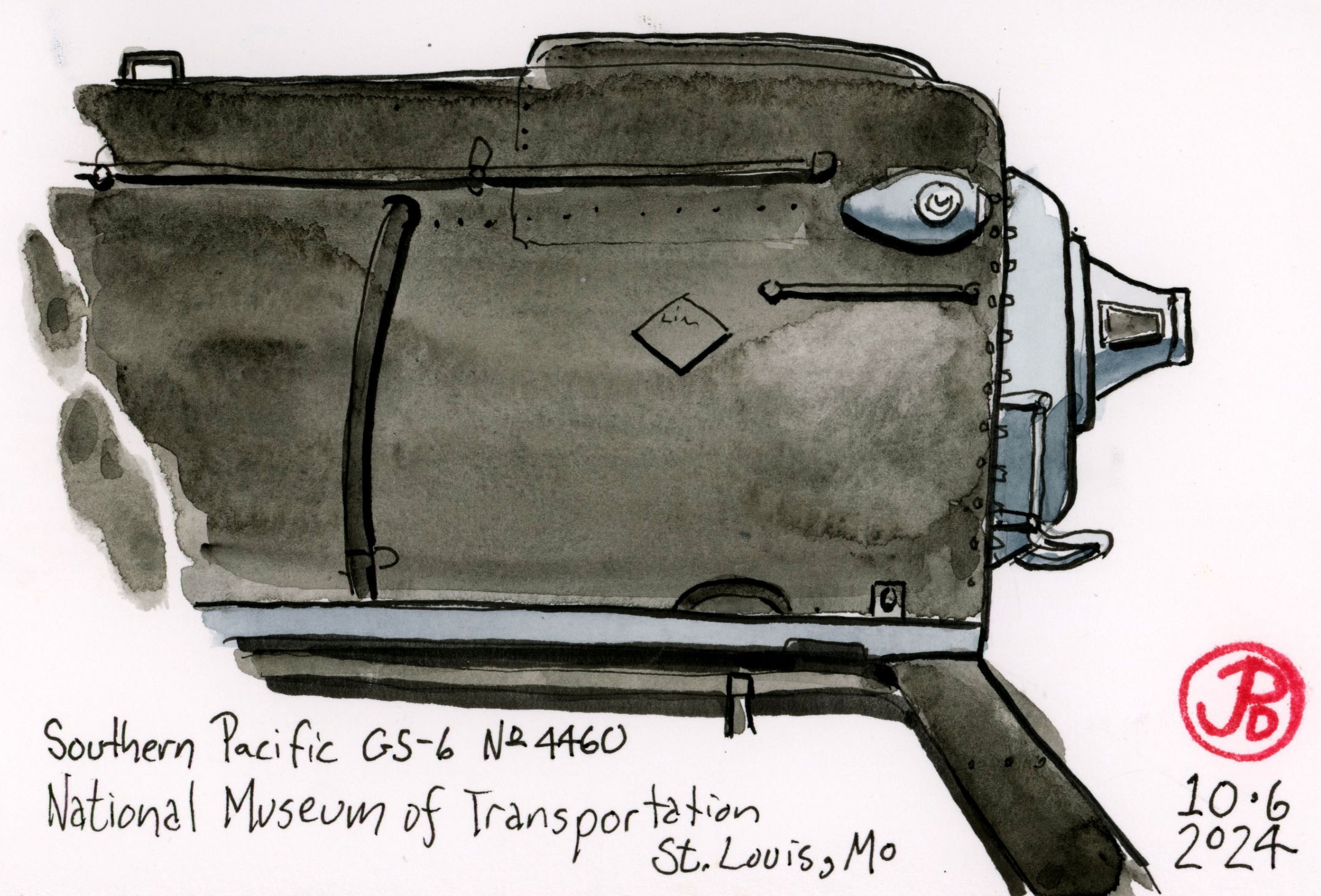 This 42 acre museum is in the St. Louis suburb of Kirkwood. Its collection of railroad history includes: Aerotrain No. 3, Big Boy No. 4006, Norfolk & Western Y-class No. 2156, UP Centennial No. 6944, the Silver Charger No. 9908, and the steam locomotive that I was really looking forward to seeing/ sketching: Southern Pacific’s GS-6 No. 4460 (featured sketch).