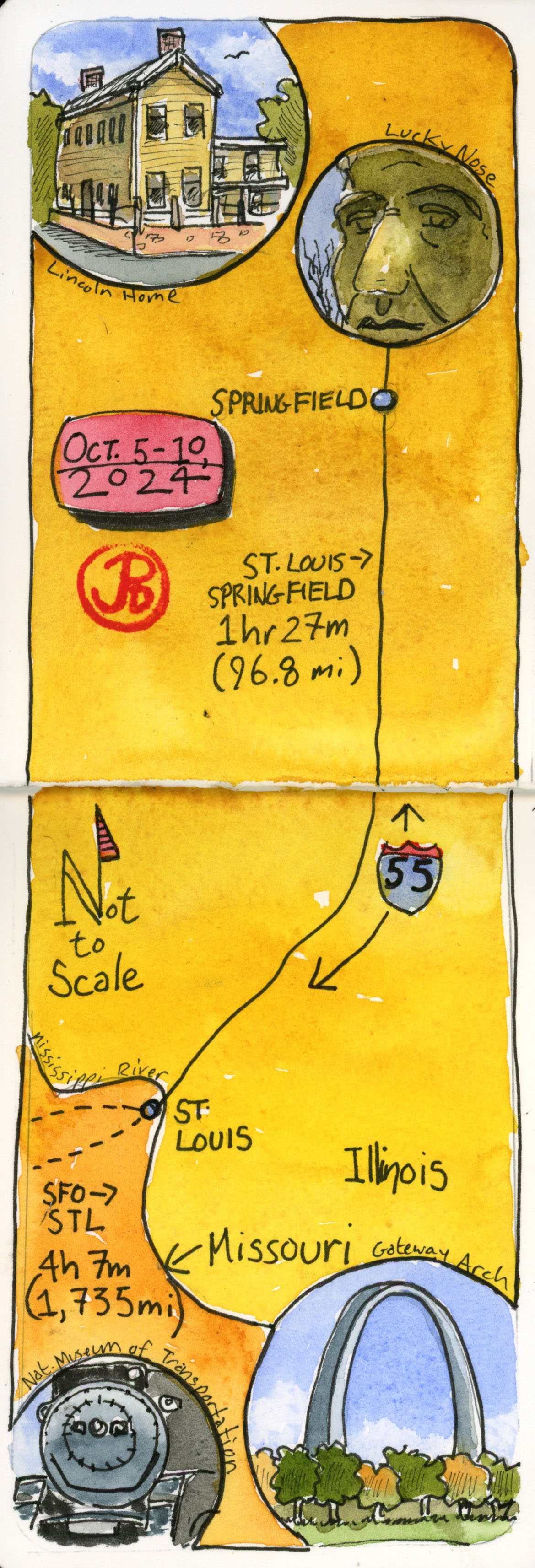 In circular inserts I illustrated four of my sketching targets: Lincoln’s house in Springfield, the Lincoln bust at his his tomb (visitors rub his nose for good luck), the National Museum of Transportation (featuring Southern Pacific’s No. 4460), and the Gateway Arch on the banks of the Mississippi in St. Louis.